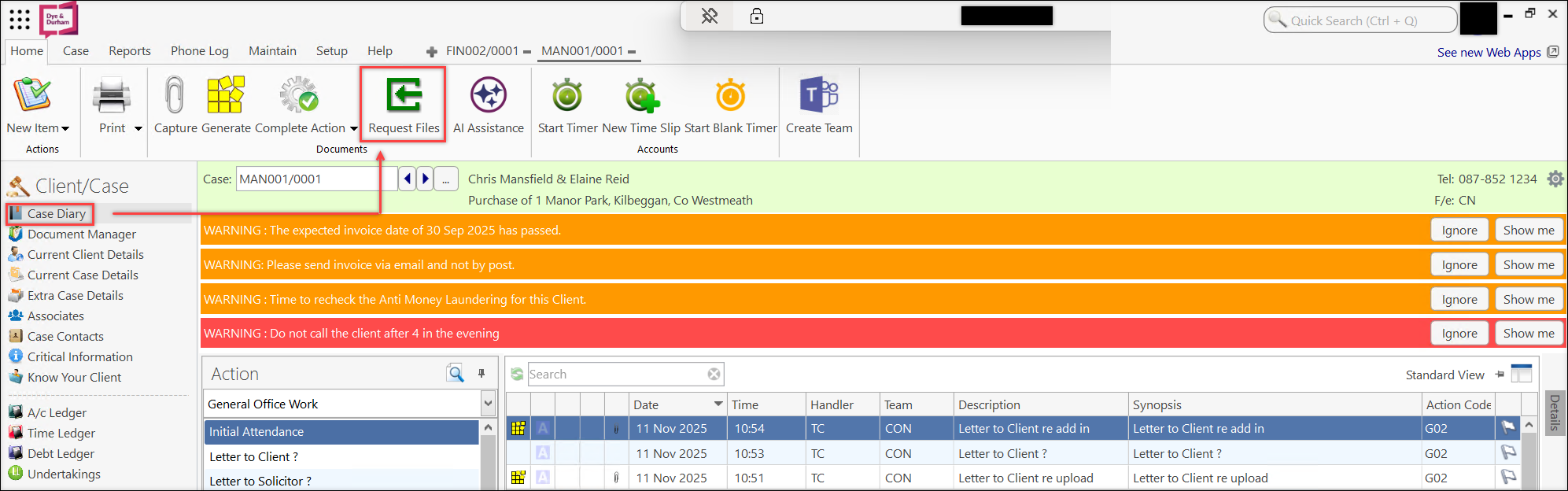 - To send the request file link, go to Case Diary and then click on Request Files.