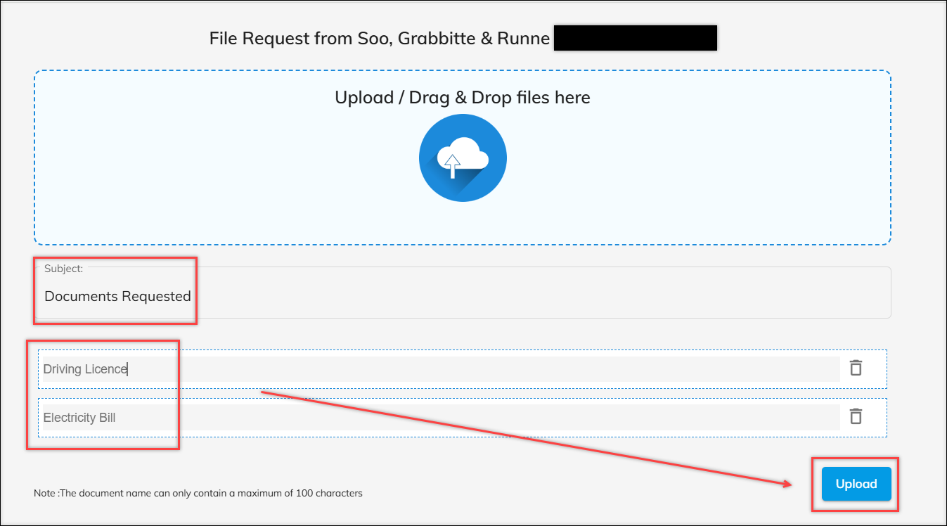 - When the client clicks on the link, they will be directed to a page that prompts them to upload their files. They can also enter a Subject Line and rename the documents if desired. After selecting the documents, they just need to click on Upload to submit the files into Keyhouse.
