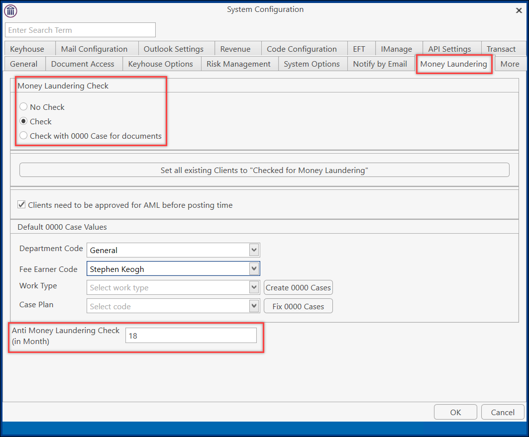 1. Set the Anti-Money Laundering check to the required number of months, usually between 12 and 18, but this is dependent on the assessed risk of the client and the nature of the transactions. And then click OK.
